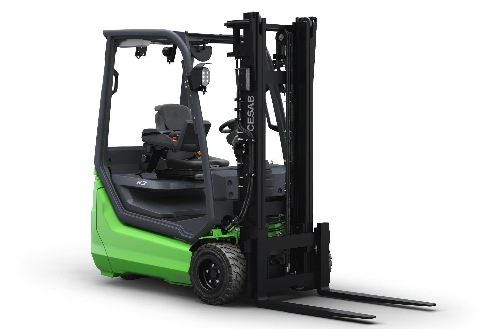 Incorporating CESAB’s Intelligent Stability Design (ISD) and Intelligent Mast Design (IMD), the B300 prioritises operator safety and load control while maximising productivity. The rear twin-wheel configuration enhances traction and load stability, offering precise handling on various surfaces. The operator-centric design features a spacious cabin with ergonomic controls, providing comfort during extended shifts.