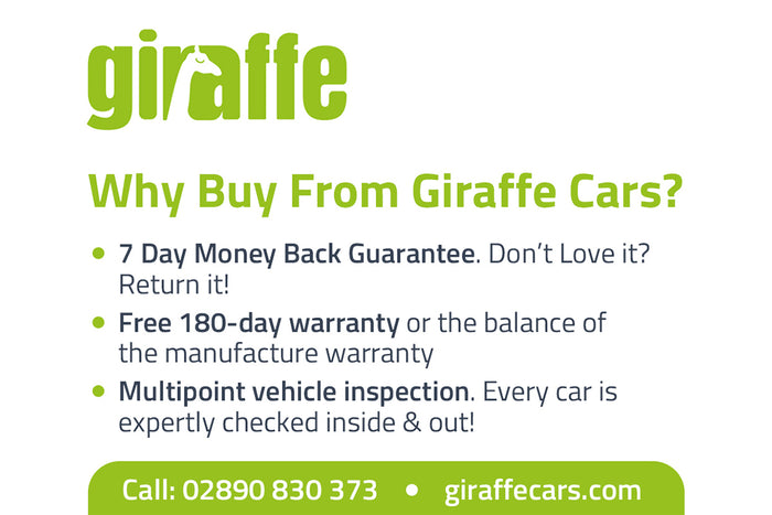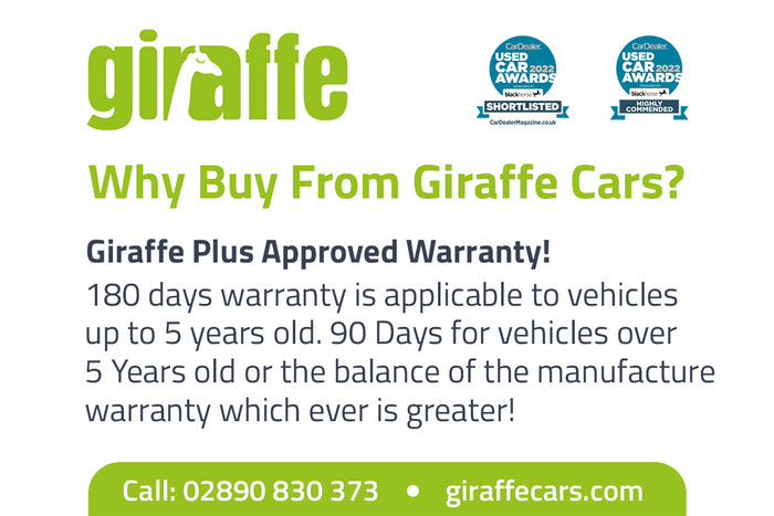 Vehicles under 5 years old come with a minimum 6-month free warranty, with the option to upgrade to 12, 24, or 36 months with our Giraffe Plus Approved Warranty. (If the vehicle has remaining manufacturer warranty, this takes precedence.)