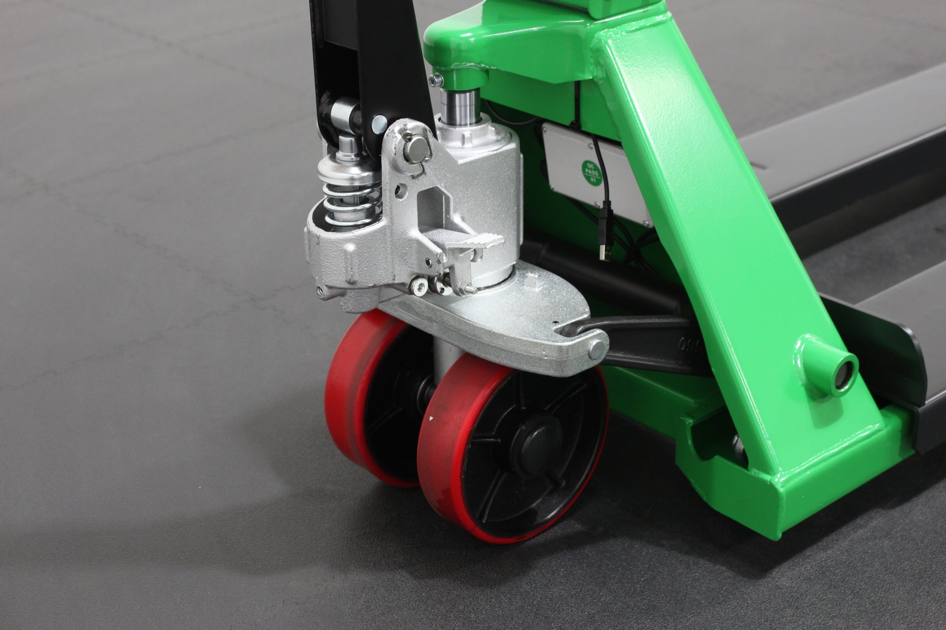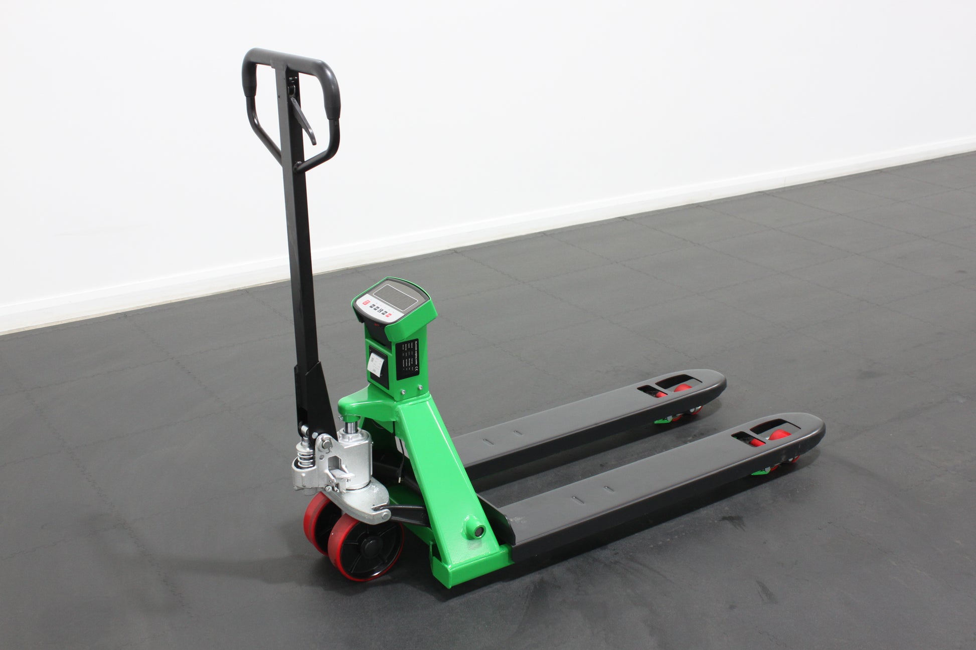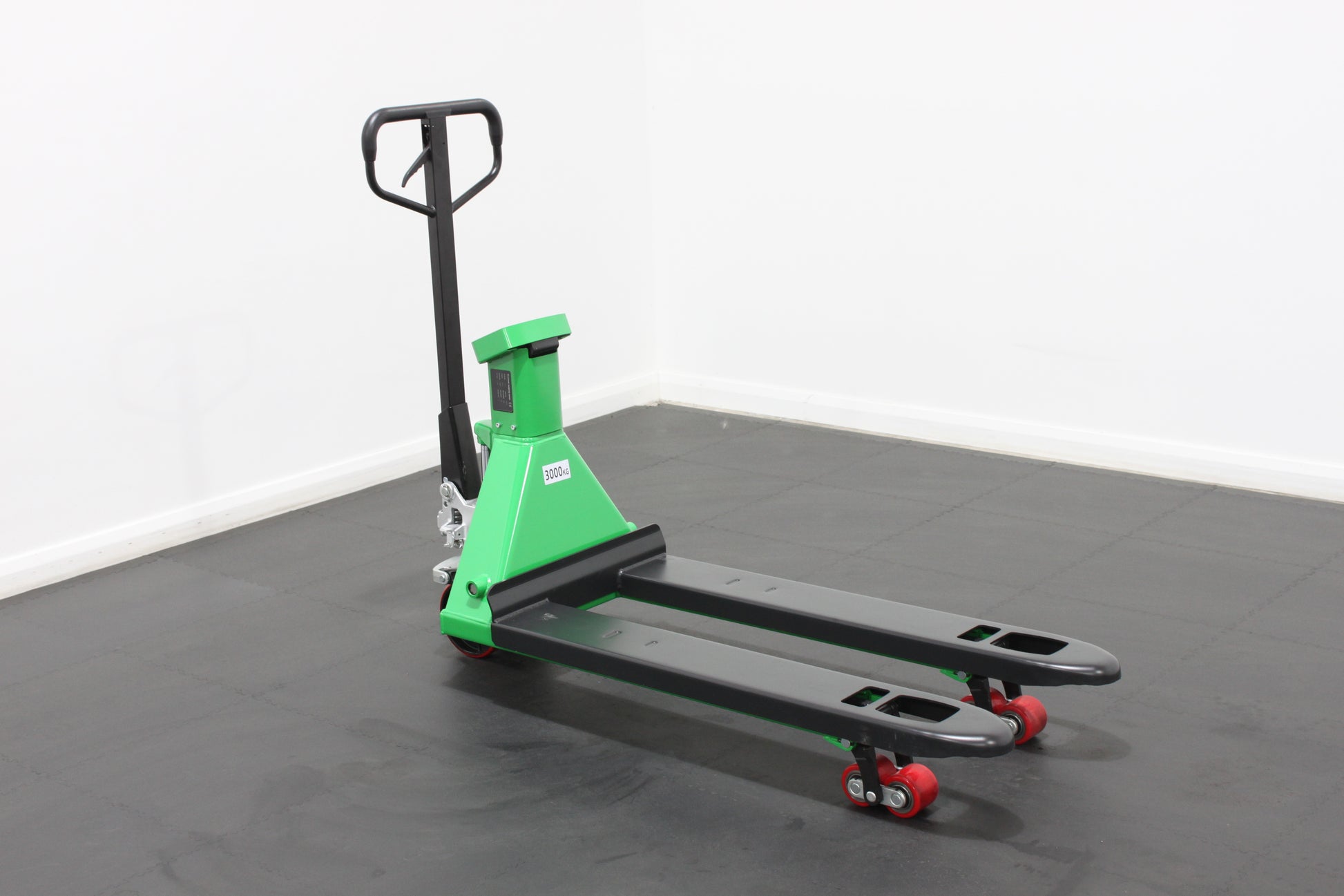 Introducing the giraffe Manual Pallet Truck with Integrated Weighing Scales, a premium, heavy-duty solution designed for efficient pallet handling and accurate on-the-go weighing in warehouses, factories, and distribution centres. Finished in a distinctive giraffe green, this EURO-spec pallet truck (555x1150mm) combines precision engineering with durable construction, offering a 3000kg load capacity for everyday use. The integrated oil cylinder features a sealed design that eliminates leakage and ensures fast, powerful lifting performance. Fitted with polyurethane (PU) wheels, it glides effortlessly across concrete and asphalt surfaces while minimising noise — ideal for both indoor and outdoor applications. Additional auxiliary climbing wheels provide enhanced manoeuvrability over ramps and uneven ground. A robust, performance-grade hydraulic pump, supported by 4 V-shaped reinforcements, guarantees smooth operation and long-lasting reliability. Operators will appreciate the ergonomic handle with full control over lifting, lowering, and steering, alongside measurement marks on the fork toes for precise positioning. Seamless welding, a push rod lifting adjustment system, and a quick-lift pump option (available on select models) make the GIRAFFE pallet truck not only high-performing but also user-friendly and efficient. With a compact design, 200° turning radius, 7” poly-over-aluminium steer wheels, and rounded fork tips with nylon guide rollers, navigating tight spaces and engaging pallets becomes effortless. The high-quality pump unit features a hardened, chrome-plated ram and piston, plus top-of-stroke and overload protection for enhanced safety. Smooth lowering is ensured by a specialised valve, while single-point valve replacement, solid steel push rods, and sealed, lifetime-lubricated bearings simplify maintenance and extend service life. Built with a robust powder-coated finish for superior resistance to rust and wear, the giraffe Manual Pallet Truck with Scales sets a new benchmark in handling performance and reliability — making it the perfect choice for businesses seeking strength, precision, and value.